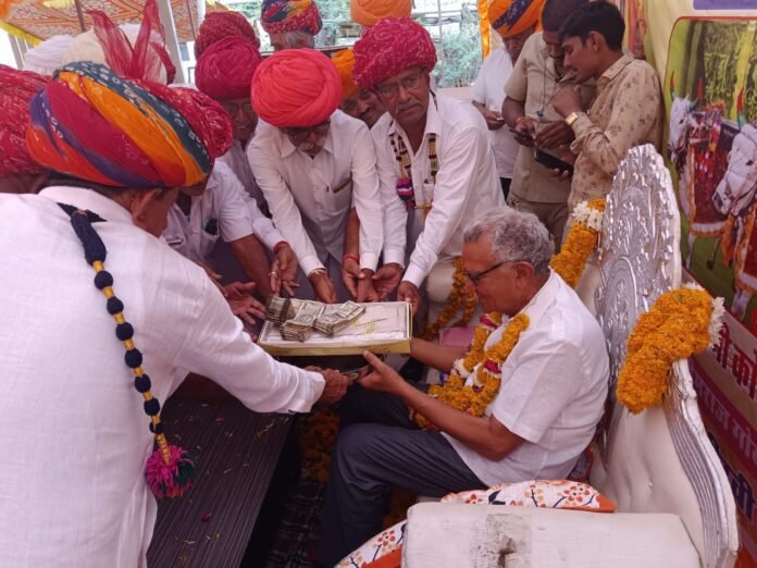 उन्होंने कहा कि समाज की हर संस्था को संकल्प लेना चाहिए कि वे अपने क्षेत्र में भी ऐसा सुंदर भवन का निर्माण करेगें। बैल टीका की बोली के लाभार्थी बाबूलाल लछेटा, दीवान साहब के टीका की बोली के लाभार्थी खेताराम परिहार, भवन उद्घाटन बोली के लाभार्थी चिमनाराम चोयल और भी अन्य बोली के लाभार्थी ढगलाराम परिहार, घीसाराम काग,चिमनाराम चोयल, भंवरलाल काग वीरमराम पवांर, राजाराम पवांर ने कार्यक्रम में बढ़ चढ़कर बोली में हिस्सा लिया । समाज की ओर से भवन निर्माण चढ़ावों के लाभार्थी परिवारों का सम्मान किया गया ।